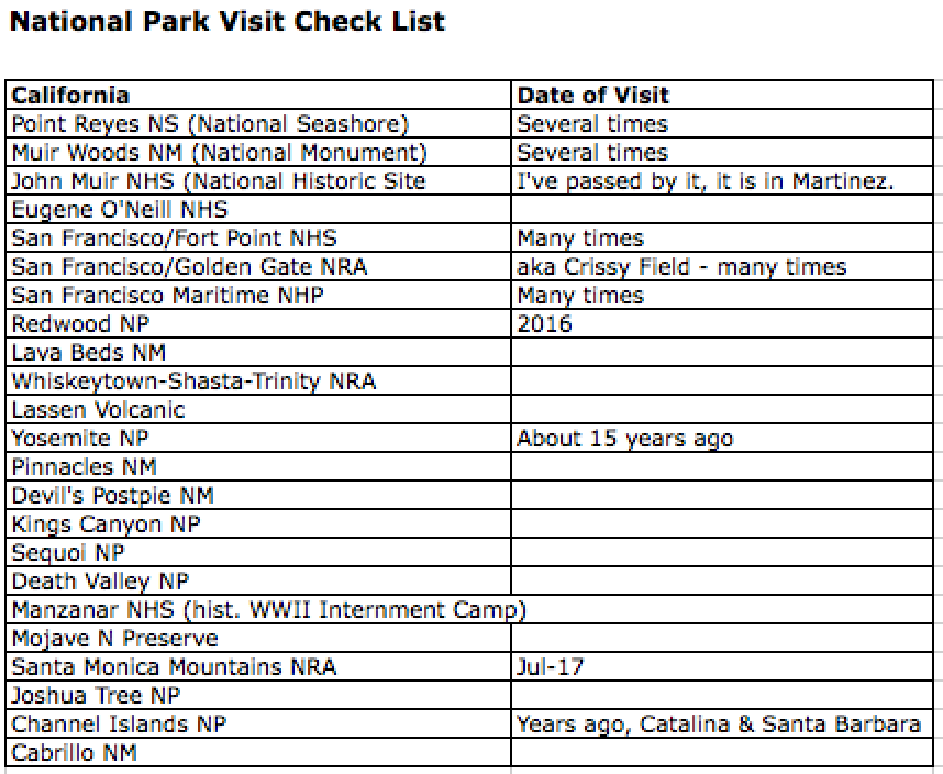 Just compiling the list was educational. I’d never heard of Manzanar. Next step is to visit the Muir Woods, which I’ve been to, and which is close to me. The purpose is to obtain a Senior Pass for the National Parks. It is my understanding that the wait time for purchasing one online takes several months and this will take a few hours, plus give me a nice outing. The hard part is finding places to stay during the busy summer season.