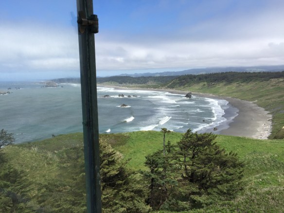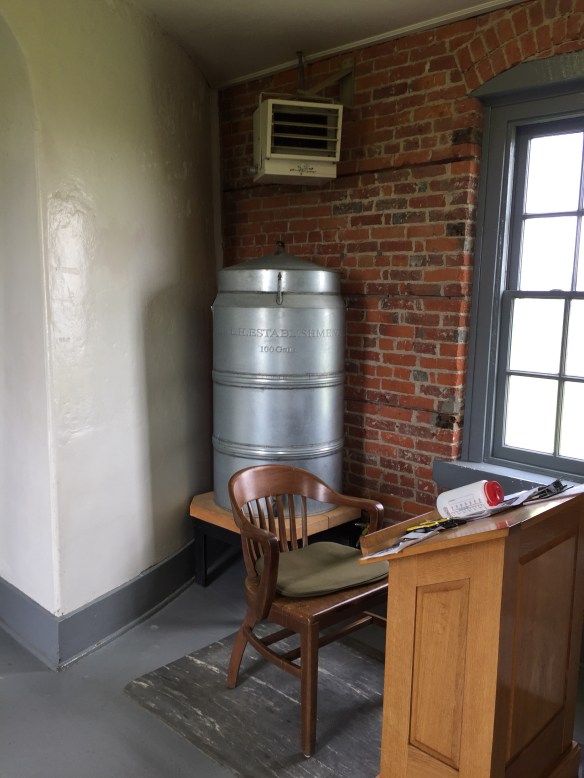 The only difference between the layout of this building and the others we have seen is there is no passageway between the keeper’s workroom and the three-flight stairwell. We visitors were allowed to climb the iron stairs to the walkway that surrounds the lens, a different perspective from climbing into the lens as we did at the Umpqua River Lighthouse.