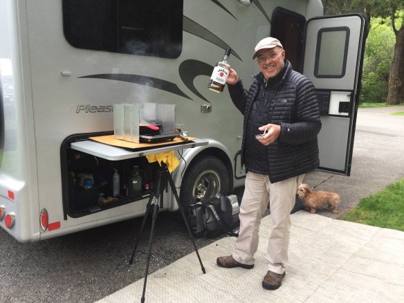Bill did his outdoor grilling in a different manner. He employed a tripod to support the hatch cover of one of his storage closets to make a table. Then he cooked pork chops and pineapple in a cast iron pan on an induction plate. He surrounded the plate with a small metal folding screen to keep the splattering grease off his fancy paint job. Sonny Boy the dachshund watched from behind.