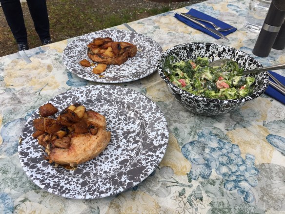 Once the pork chops were cooked, Bill doused them with bourbon. They looked and smelled yummy. BJ added a broccoli salad.