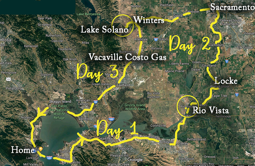 In case you don’t feel like watching the seven-minute video, here’s the map and some of the highlights: First night at my favorite Sandy Beach County Campground in Rio Vista on the Sacramento River. Gorgeous drive along the levees toward Sacramento, with a stop at the old Chinese town, Locke. A Starbucks stop in Sacramento, then west toward Lake Solano, another county park (only $20/night for seniors plus a dollar/dog). I stopped at a bakery in Winters, which is an adorable town, and purchased a yummy chocolate eclair. I spent a peaceful night in the woods with the peacocks by Lake Solano. Sunday morning I explored Winters, then headed home with a stop at the Costco in Vacaville to fill up on gas. A perfect trip. I highly recommend it.