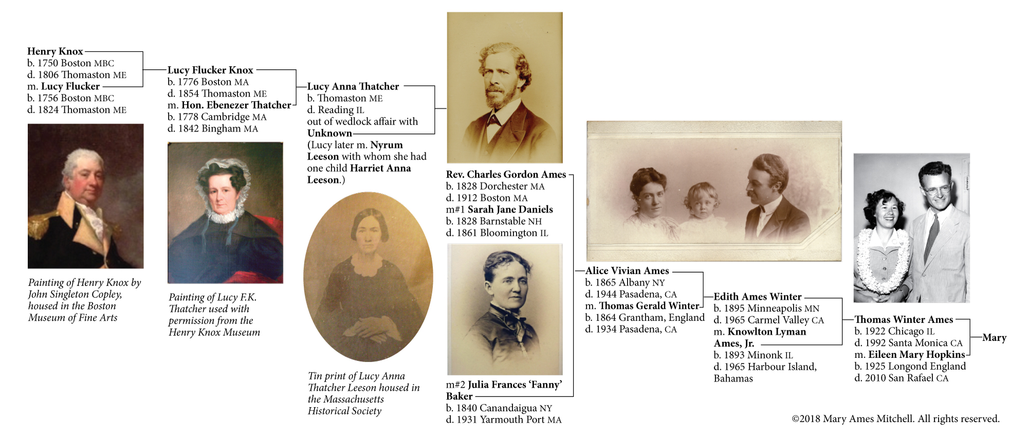 Charles had been an illegitimate child. He was the son of Lucy Anna Thatcher, who was the daughter of Lucy (Knox) and Ebenezer Thatcher. Lucy Knox Thatcher was the daughter of Henry and Lucy Knox. (A stack of family letters that is now in the Schlesinger Library at Radcliffe College proves this.) During the time Lucy Anna was pregnant with Charles, it was socially unacceptable to be an unwed mother. She gave him up to foster care. The foster parents gave Charles his last name Ames. No one yet knows with whom Lucy had her pre-marital affair, so we don’t know what Charle’s father’s last name was. However, as mentioned in an earlier blog post, new DNA results have given us a lead. (To be continued on a later blog post.)