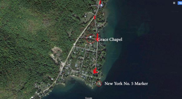 This photo was taken facing the hill, Knox traveled from Marker 3 toward Marker 4. Marker No. 4 is at the Mossy Point boat ramp at the north end of Lake George.